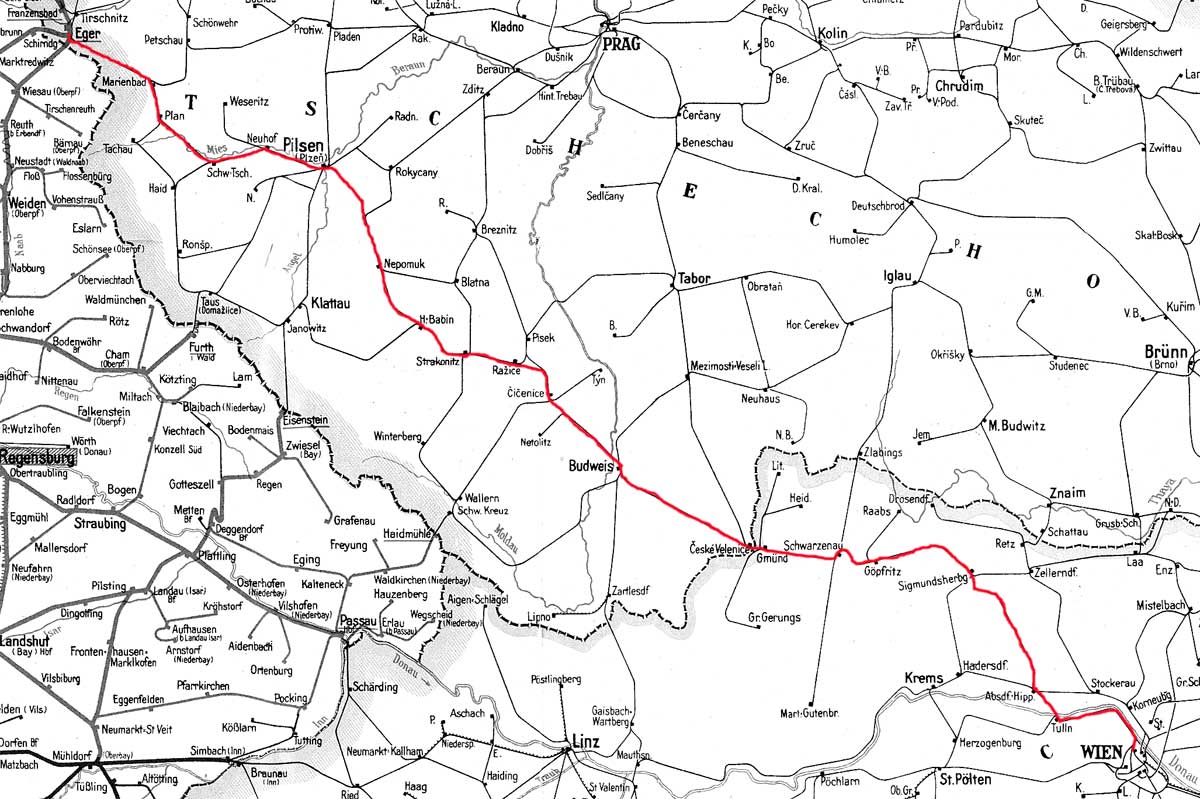 Wien Franz-Josefs-Bahnhof 0,104 - Tullin 33,050 - Absdorf-Hippersdorf 43,920 - Eggenburg 78,684 - Sigmundsherberg 88,624 - Göpfritz-Döllersheim 121,442 - Schwarzenau (Waldviertel) 138,250 - Gmünd (Waldviertel) Stadt 161,929 - Grenze Österreich/Sudetengau 163,100 - Gmünd (Waldviertel) Hbf 164,062 - Gratzen (Nové Hrady) 177,080 - Grenze Sudetengau/Protektorat Böhmen und Mähren - Petersin (Petříkov) 181,9 - Budweis (České Budějovice) 213,388 - Pilsen Hbf (Plzeň hlavní nádraží) 349,094 - Grenze Protektorat Böhmen und Mähren/Sudentengau 358,5 - Eger (Cheb) 455,01