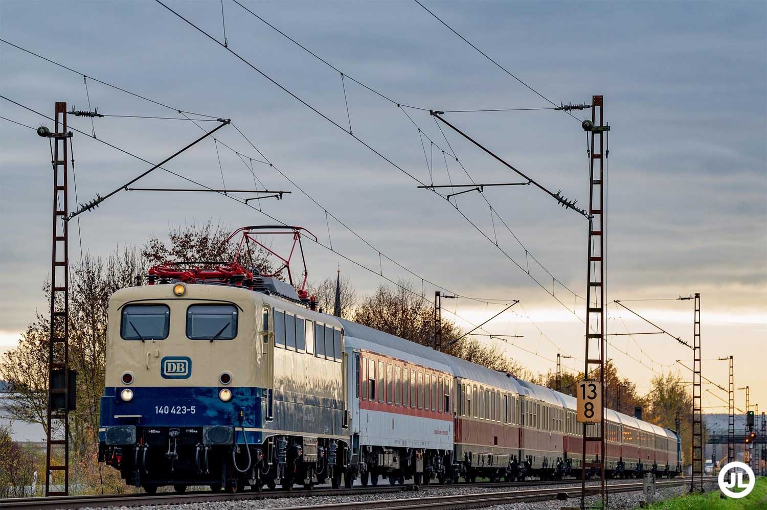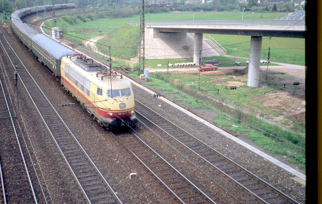 Der Zug mit der 103 194 befindet sich auf der Strecke Flieden 0,0 - Gemünden (Main) 56,338