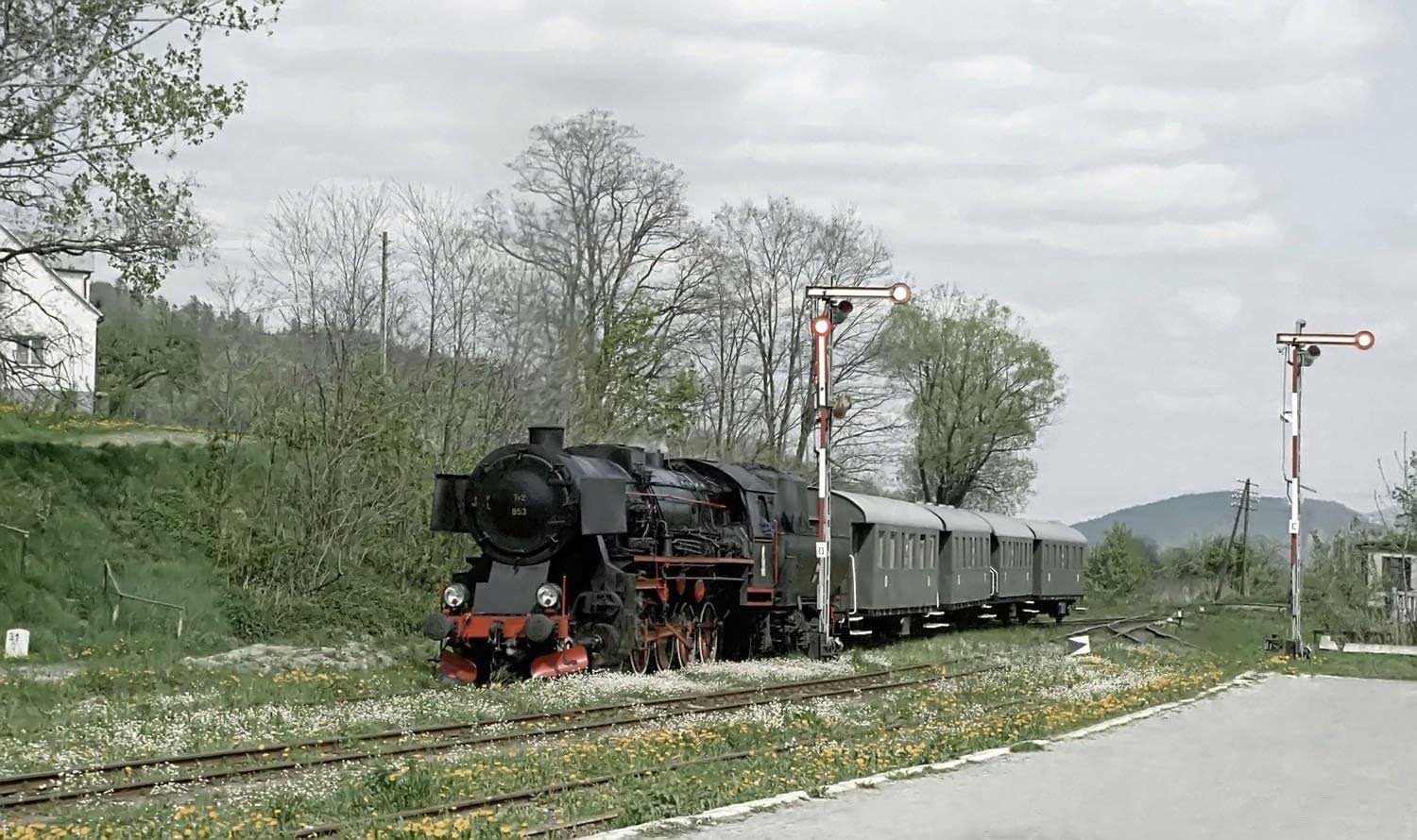km 31,2 in Dobra koło Limanowej (Dobra b Limanowa) Ty2-953 (ex 52 2817) mit S 614 Foto: Łukasz Alczewski, 05.05.1999