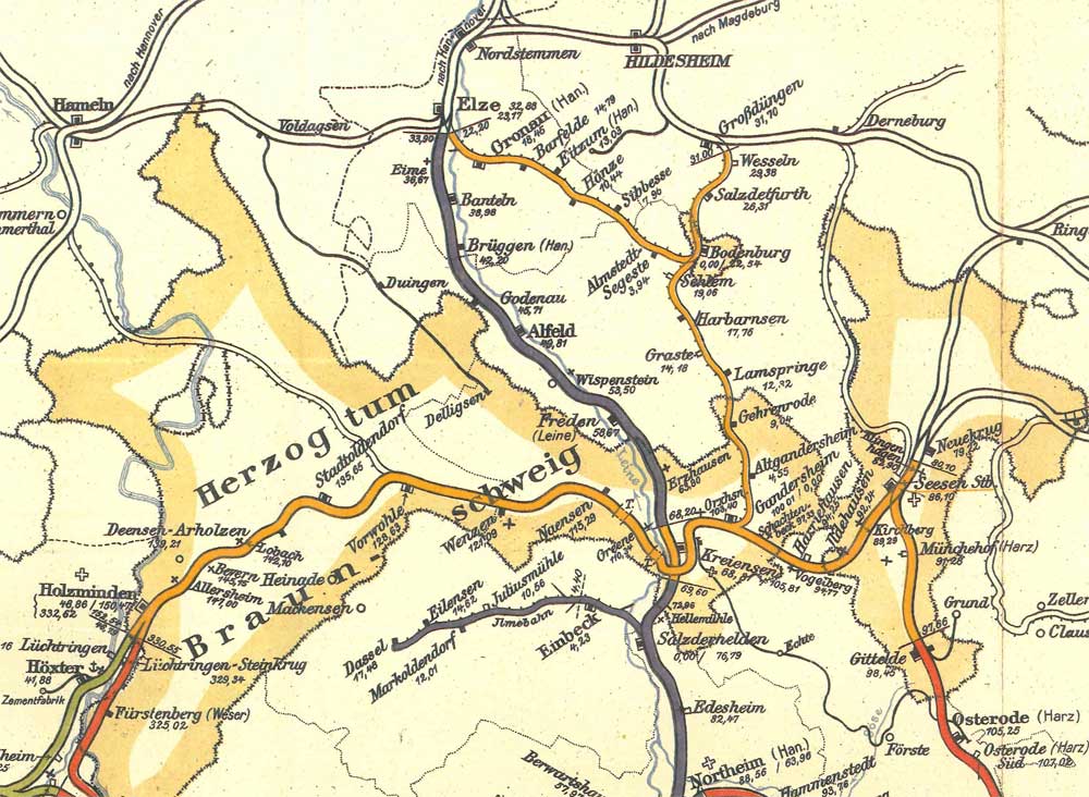 | Auf der Karte von 1945 ist die Kilometrierung bis Hildesheim Hbf eingezeichnet. Ob vor Ort die Kilometrierung verändert wurde, ist nicht bekannt. |