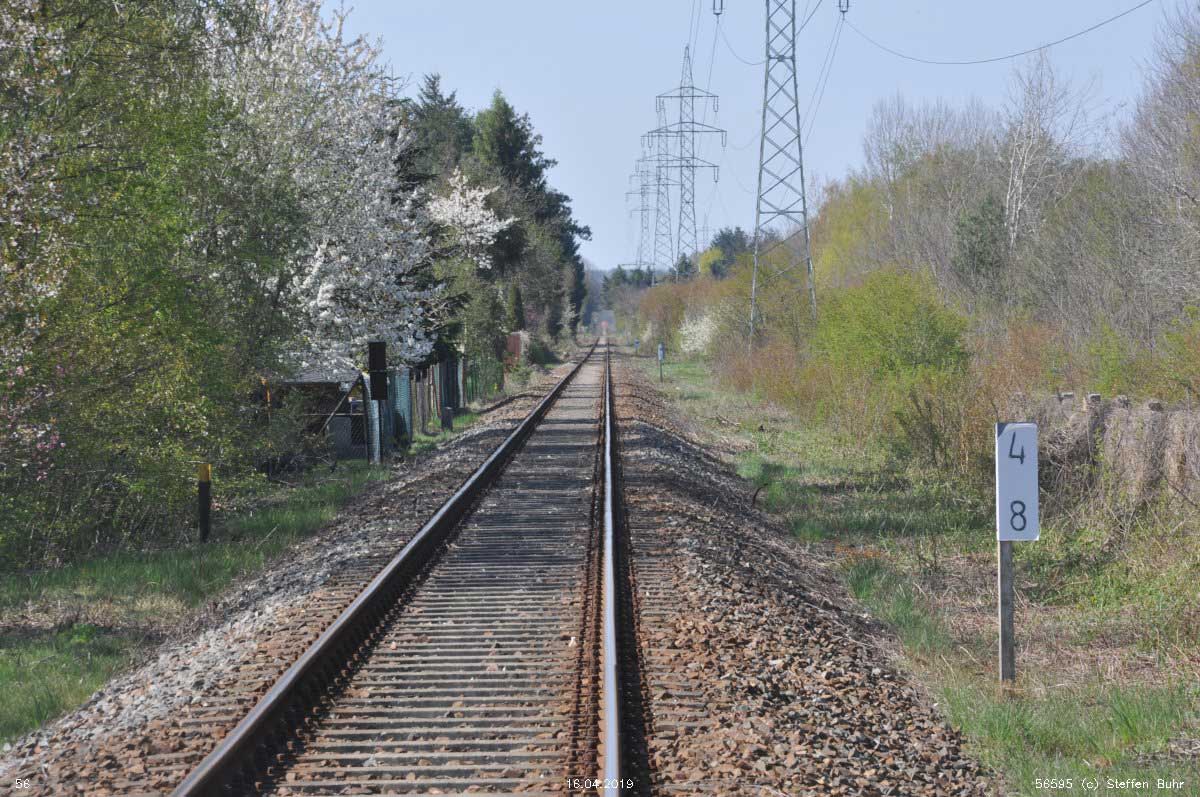 km 4,8 (Tafel) und km 4,9 (Stein links) - Blick Richtung Lauchhammer