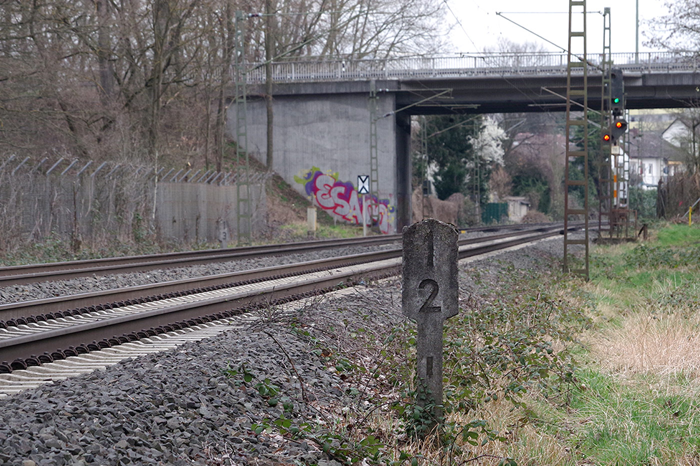 km 1,9 (Stein) und km 2,0 (Tafeln) zwischen Abzw Hanau Rauschwald und Großkrotzenburg - Blick Richtung Abzw Hanau Rauschwald
