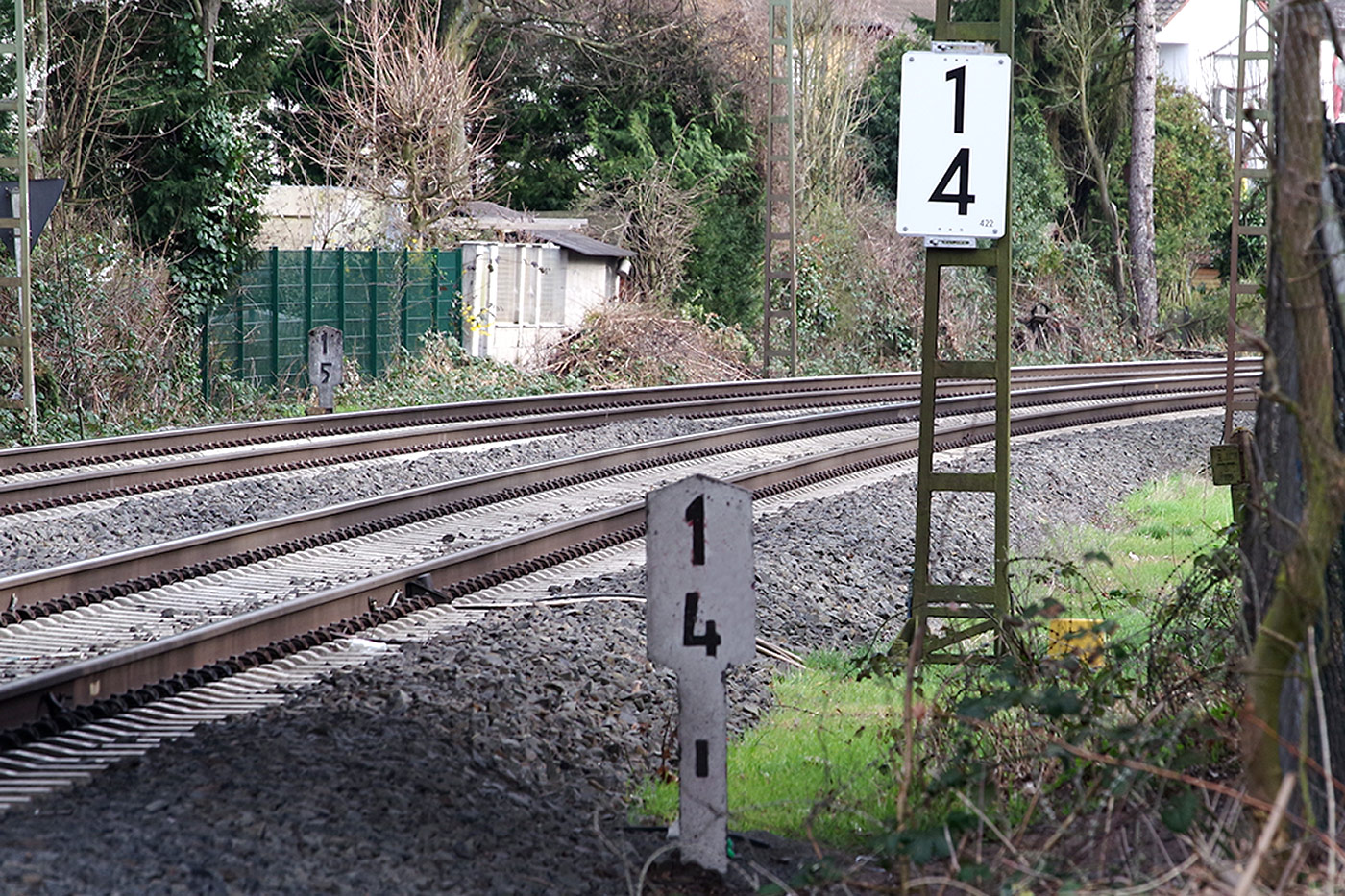 km 0,3 (Stein) und km 0,4 (Stein und Tafel) zwischen Abzw Hanau Rauschwald und Großkrotzenburg - Blick Richtung Abzw Hanau Rauschwald