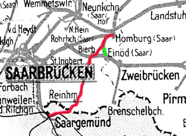 Zweibrücken Hbf 0,0 - Bierbach 6,87 - Reinheim (Saar) 24,27 - Grenze Deutschland/Frankreich 25,087 - Sarreguemines (Saargemünd) 36,80 (1948)