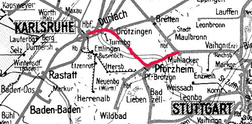 Durlach 0,0 - Pforzheim 26,27 - Mühlacker 38,90 (bis 1911/1913)