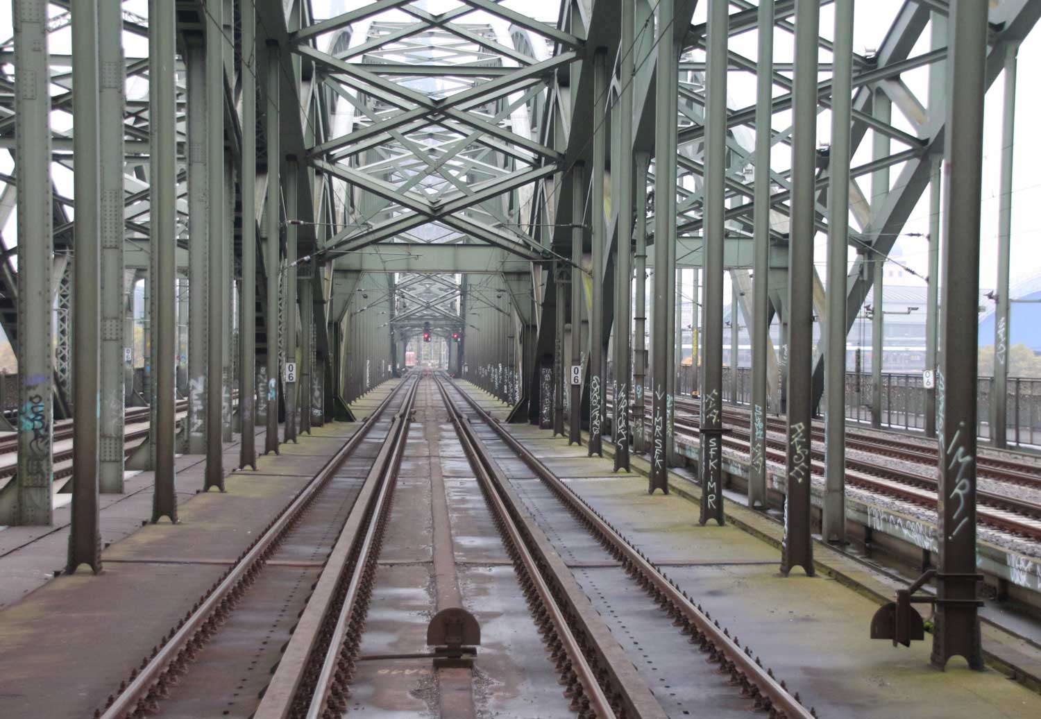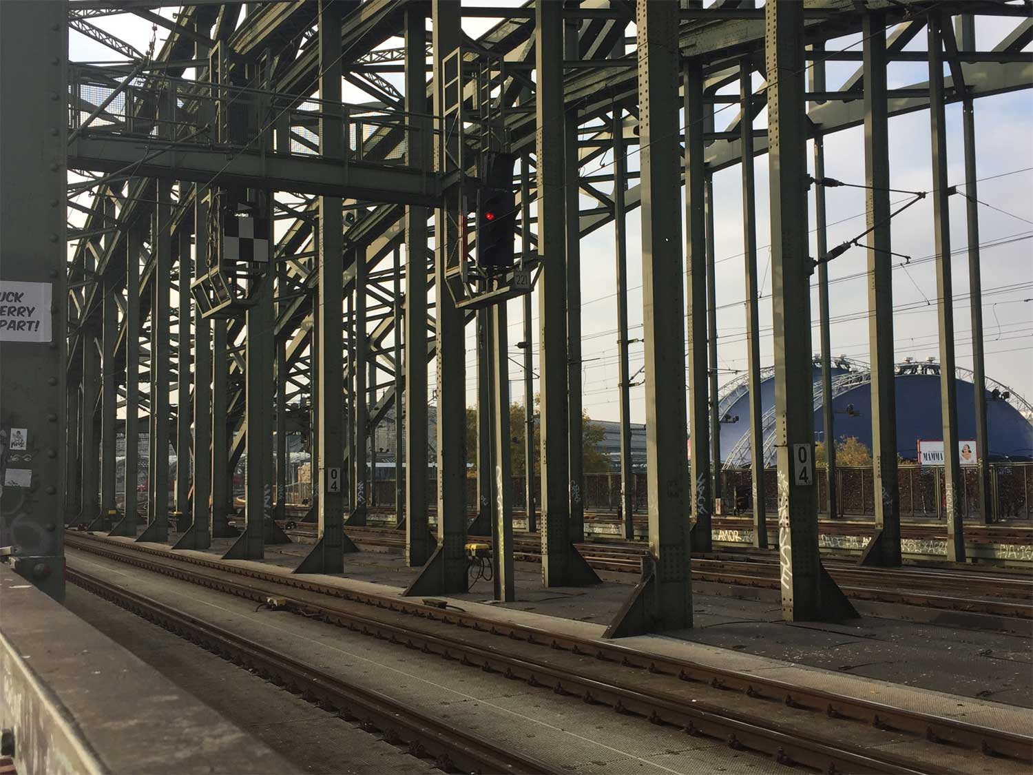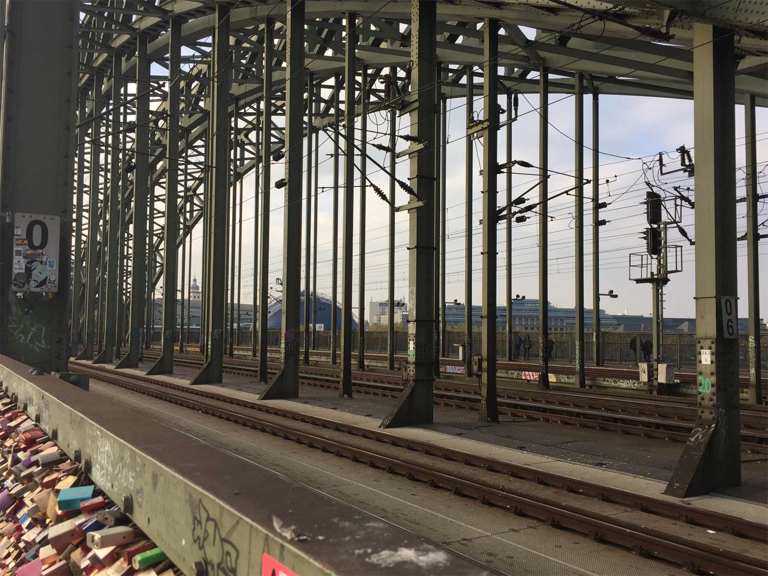 km 0,6 auf der Hohenzollernbrücke - Blick Richtung Köln Hbf