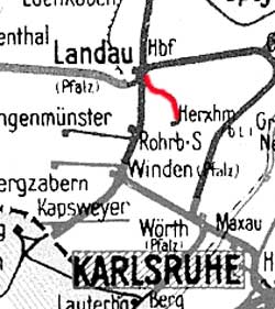 km 24,7 (links) gehört zur Strecke (Bruchsal -0,08 - Graben-Neudorf 9,61 - km 22,05 =) km 0,0 Landesgrenze Baden/Pfalz - Germersheim 3,57 - Landau (Pfalz) Hbf 24,51 - Pirmasens Nord 72,27 - Zweibrücken 96,34 - Rohrbach (Saar) 116,06