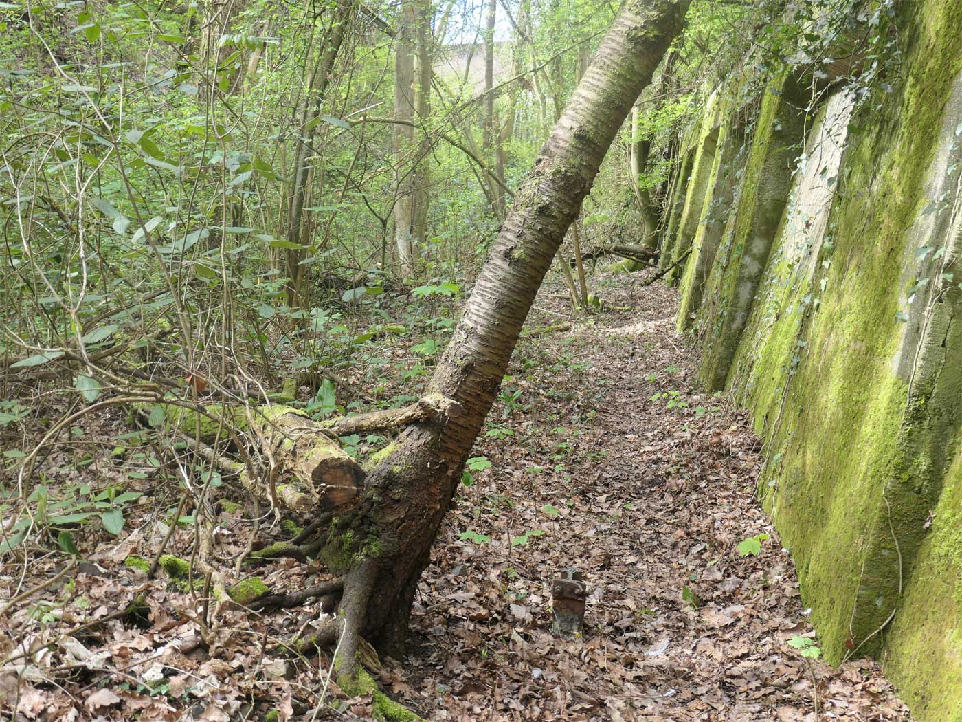 Brücke (Ludendorffbrücke) begann. Trassenreste sind im Bewuchs am rechten