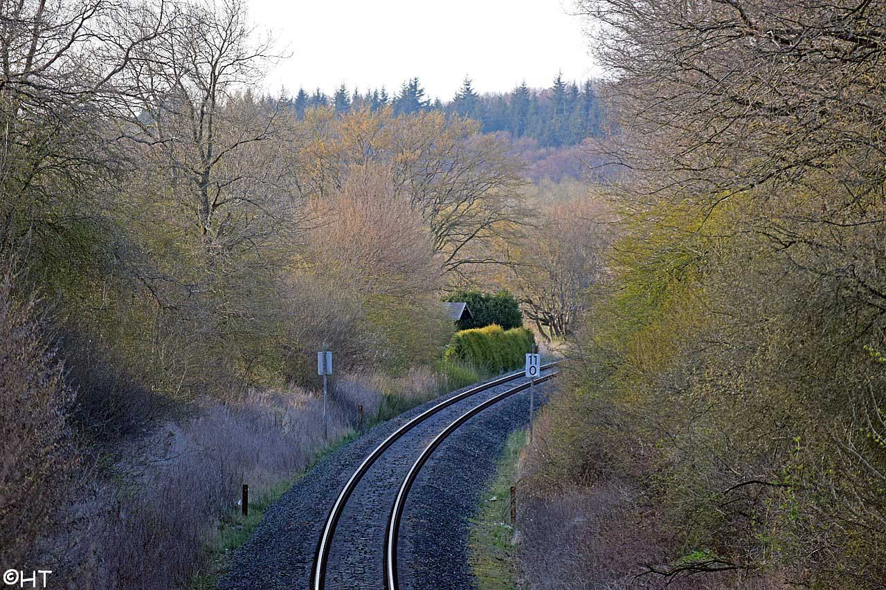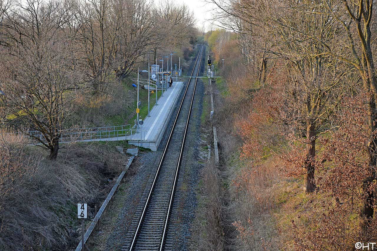 Links, nicht sichtbar die beiden Gleise der Strecke