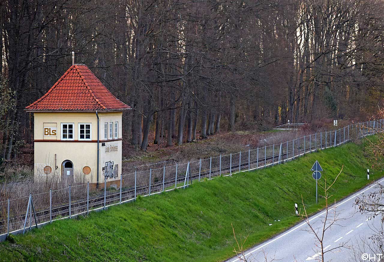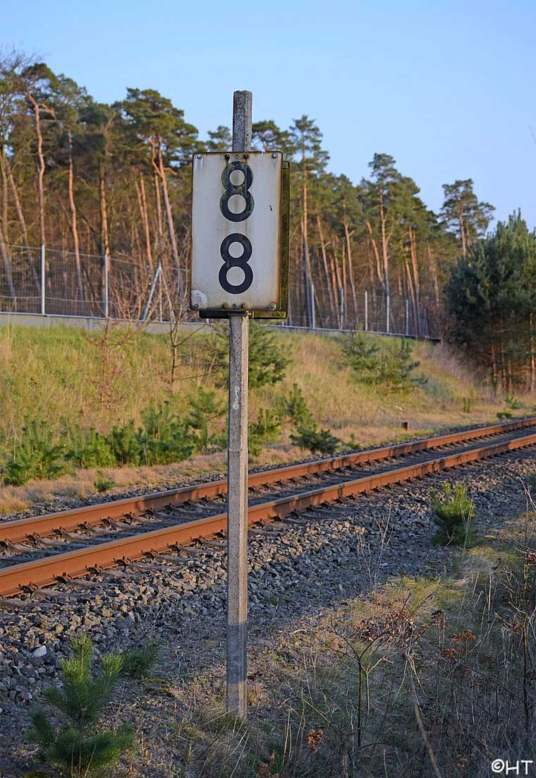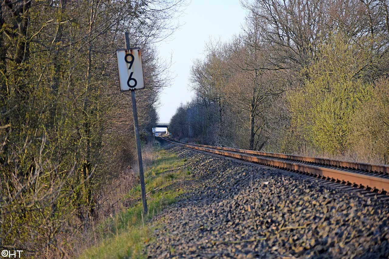 rechts das Gleis der Strecke (Lübeck Hbf 0,0) - Herrnburg 10,20 - km 10,80 + 2705 m = km 10,90 (Überlänge 2605 m) - Bad Kleinen 59,32 - Güstrow 113,26 - Malchin 156,32 - Neubrandenburg 200,94 - ehemalige Landesgrenze Mecklenburg/Preußen 234,15= [km 61,11 - Strasburg (Uckerm) 60,20 - Pasewalk 41,94 - Grenze Deutschland/Polen 13,194 - Szczecin Główny (Stettin Hbf) 0,063]