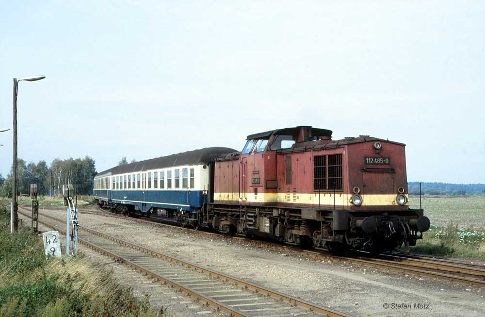 km 42,9 in Herzberg (Mark) - 112 465 mit Byl-Wagen aus Ri Rheinsberg