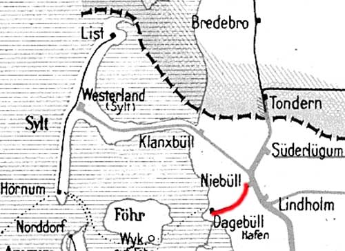 | Niebüll NVAG | 0,0 | km 198,45 der Strecke Hamburg-Altona 0,74 - Elmshorn 30,70 - Heide (Holst) 124,48 - Husum 158,26 - Niebüll 198,45 - Westerland (Sylt) 237,61 |