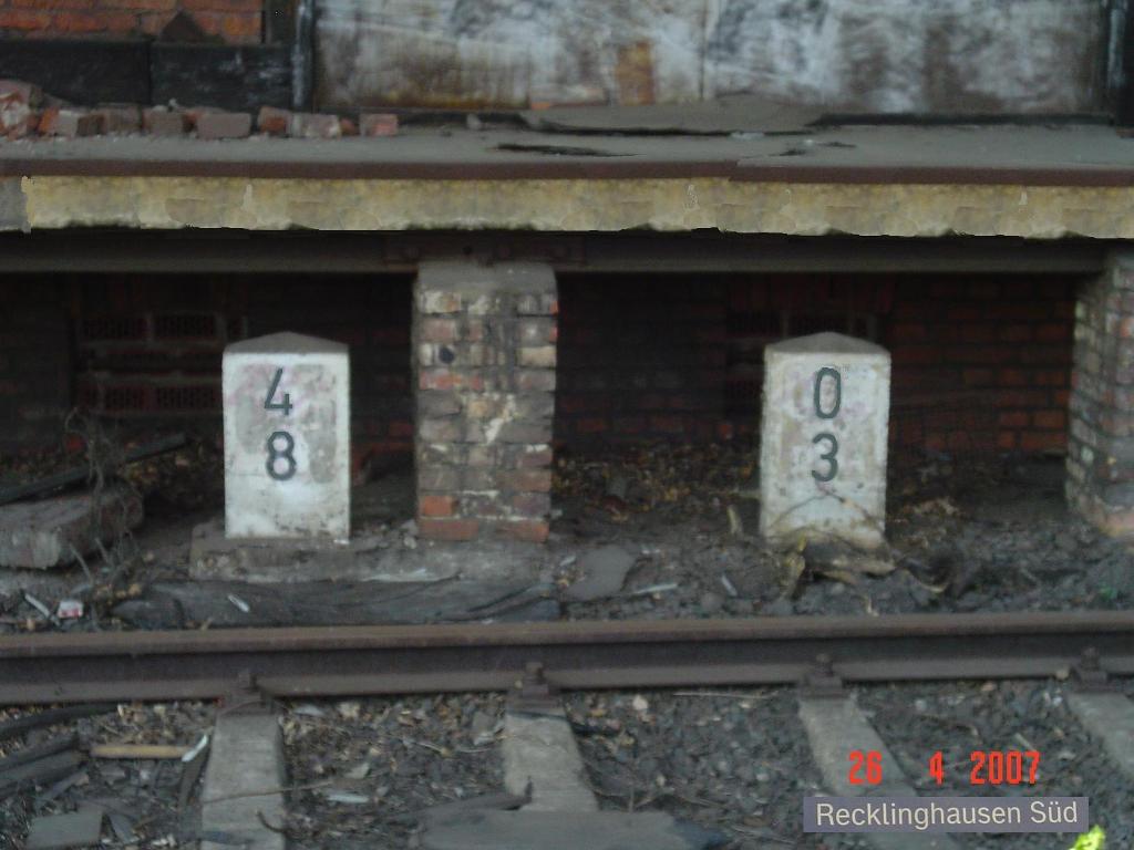 km 0,0 in Recklinghausen Süd km 0,0 gehört zu den Strecken Recklinghausen Süd 0,0 - Herne 3,80 und Recklinghausen Süd 0,0 - Recklinghausen Ost 5,30 Foto: Olaf Mensch, 26.04.2007
