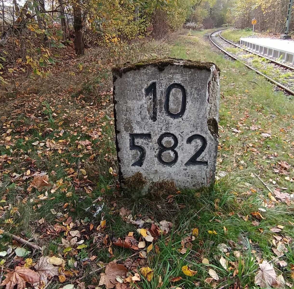 Auf der anderen Seite des Steines ist die Angabe km 10,582 (von Selbitz) zu sehen.