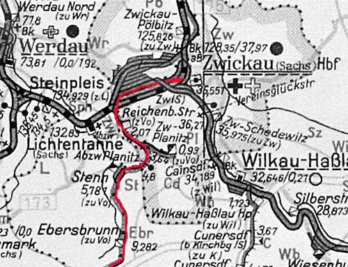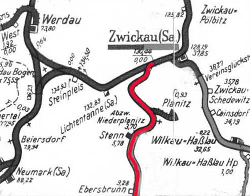 1936 wurde mit dem Bau des Rangierbf Zwickau (Sa) die Strecke nach Falkenstein separat und kreuzungsfrei in den Bf Zwickau (Sa) eingeführt.