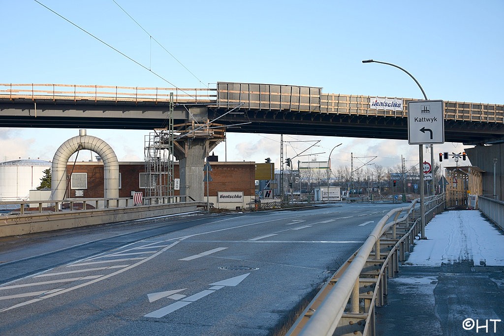 Links der Anfang der Brückenrampe zur Köhlbrandbrücke