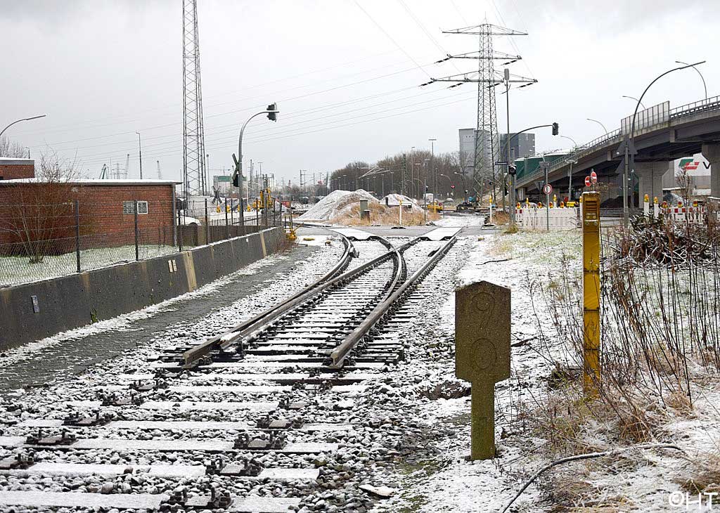 km 30,6 (rechts) gehört zur Hafenbahn Veddeler Damm, Weiche HBS 004, km 30,0 - Gleisabschluss in km 30,7 - Streckenunterbrechung - Hamburg Kai rechts