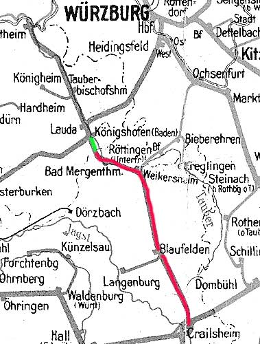 Crailsheim 0,0 - Weikersheim 47,87 - Bad Mergentheim 58,99 - ehemalige Grenze Königlich Württembergische Staats-Eisenbahnen/Großherzoglich Badische Staatseisenbahnen km 60,282 = [km 6,109 - Königshofen (Baden) 0,0]