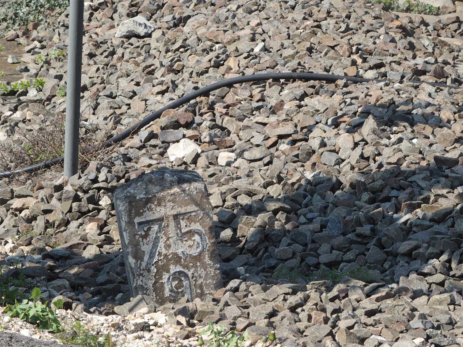 und km 125,6 (Tafel und Stein) und km 125,7 (Stein, links etwas verdeckt) - Blick Richtung Frankfurt (Main)