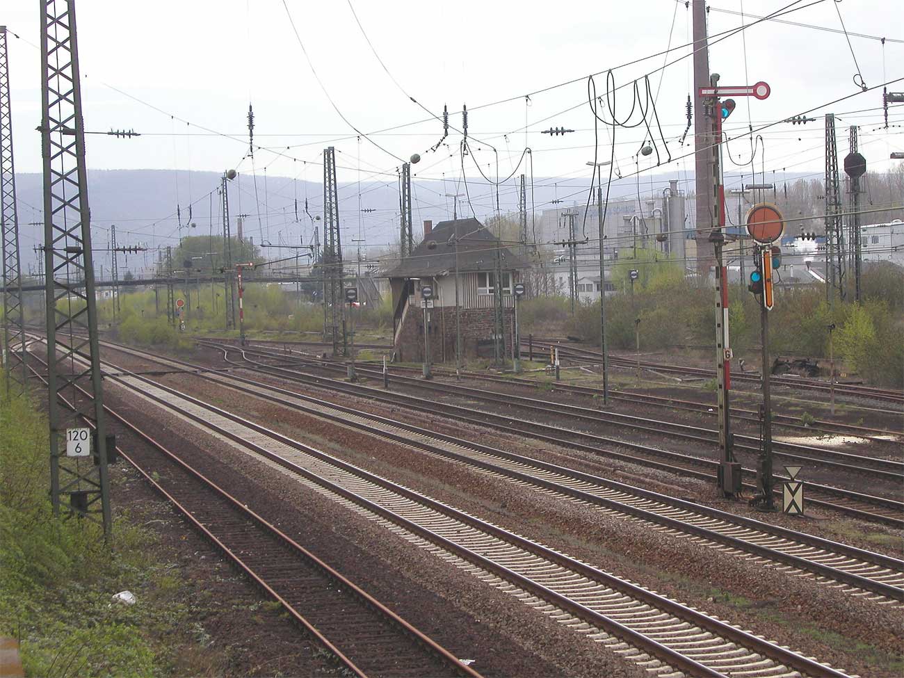 km 121,7 in Oberlahnstein - Blick zum ehemaligen Gbf und zum Brückenstellwerk Of (früher OB)