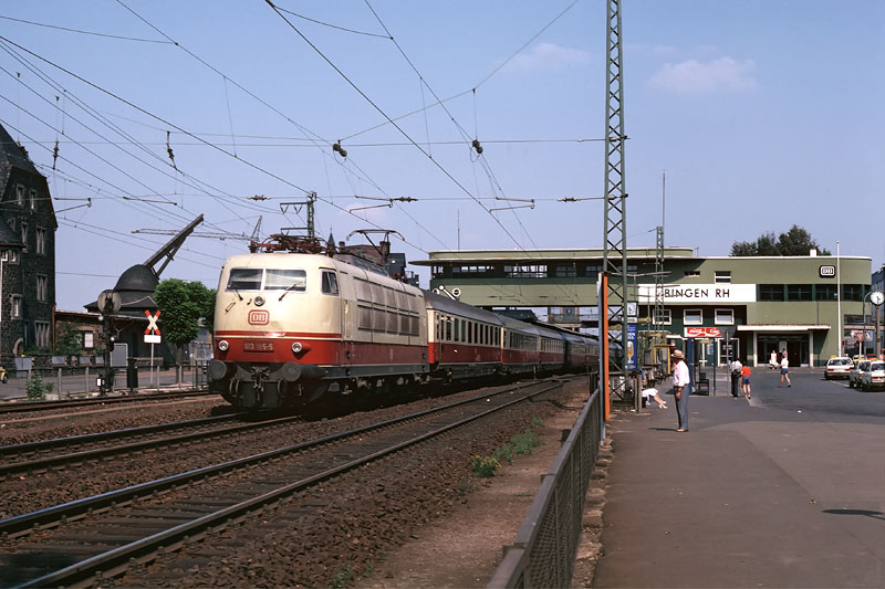 Mitten auf der Nahebrücke (Kilometer-Wechsel 0,0) rollt am 8. Juli 1981 die noch geschürzte 103 228 mit ihrem IC 524 HEINRICH DER LÖWE (München - Braunschweig) Richtung Bingerbrück; das Einfahrtsignal alter Bauart steht noch.