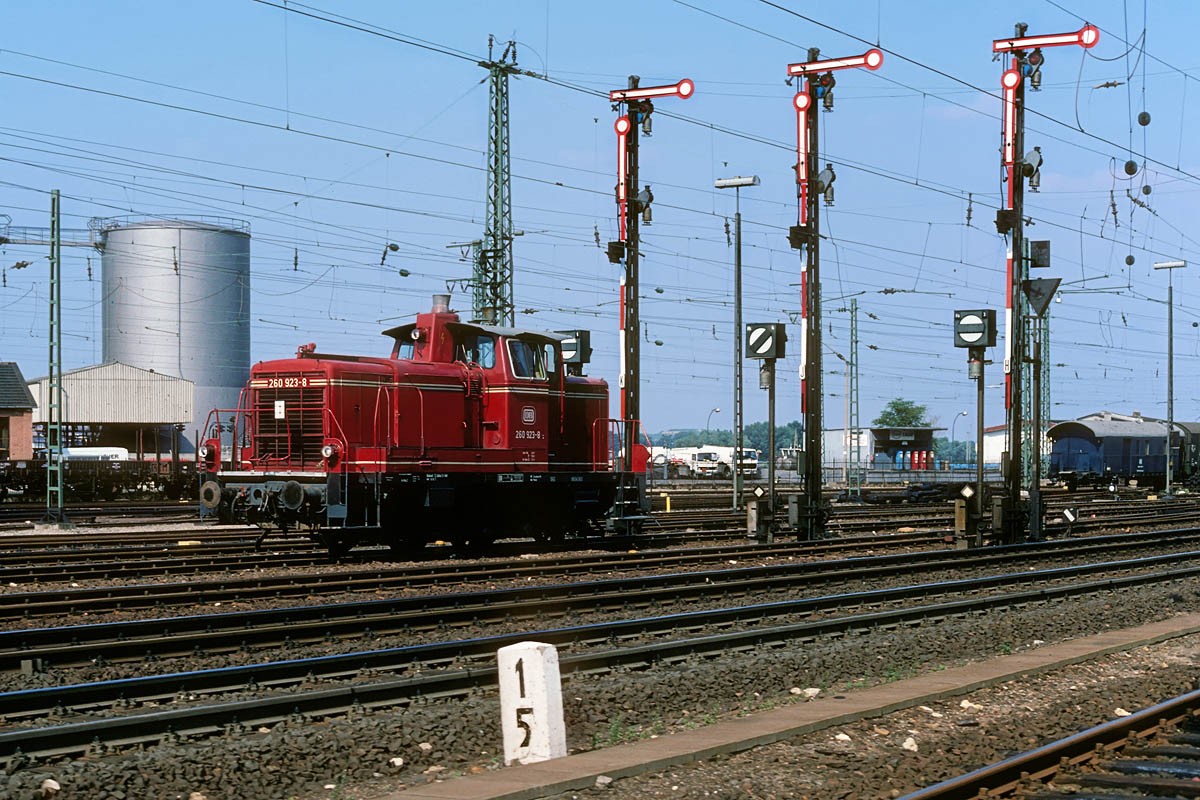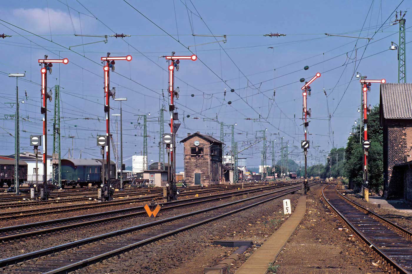 km 0,6 am 07. Juli 1981 - Signalbrücke der Westeinfahrt Bingen (Rhein) - Im Hintergrund das noch grüne Reiterstellwerk