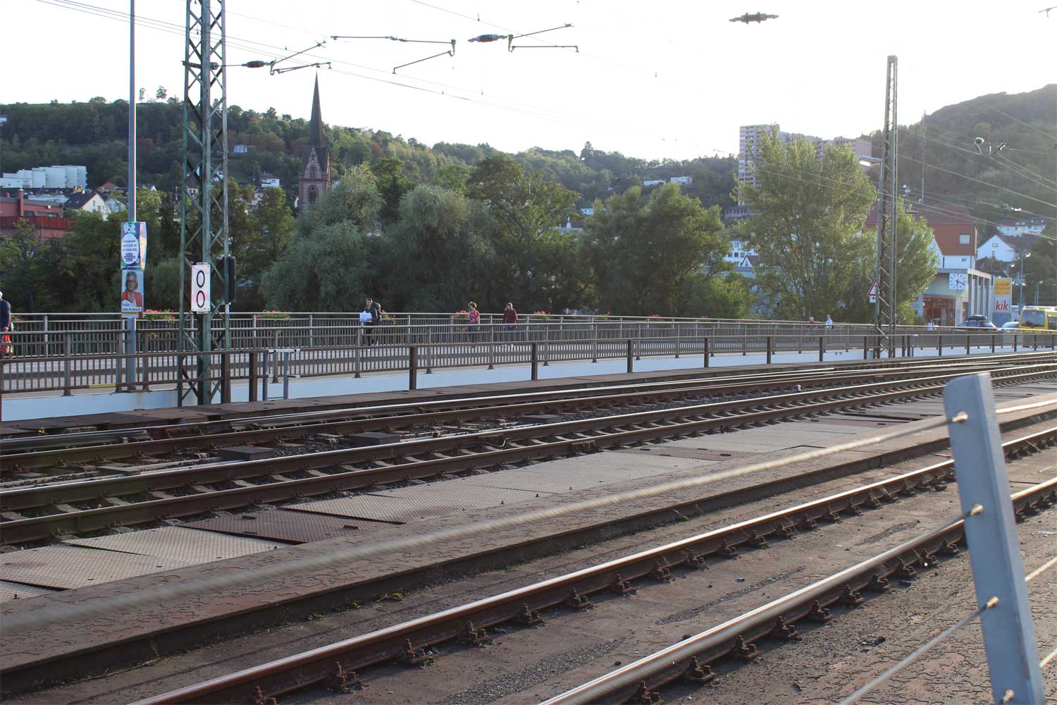 Links im Bild die Eisenbahnbrücke