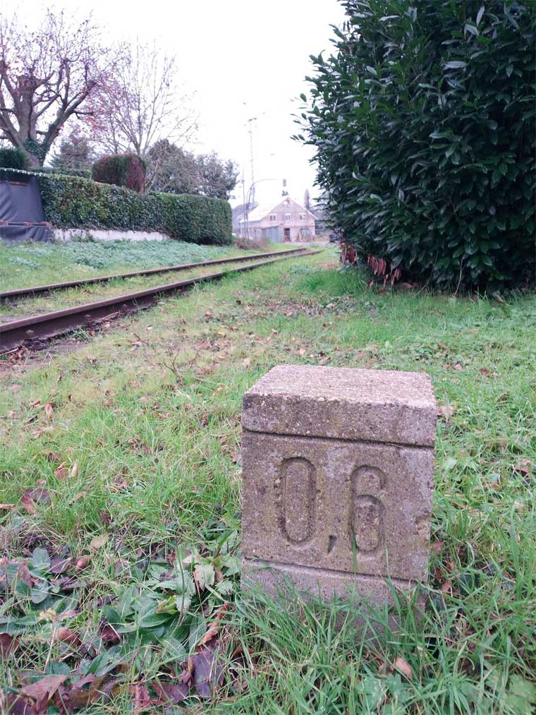 Das Gleis rechts mit km 6,8 gehört zum Richtungsgleis der Strecke