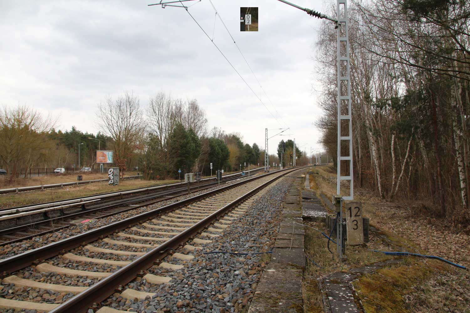 km 12,2 (Gegenrichtungsgleis, Tafel links)) am Grünauer Kreuz - Blick Richtung Berlin