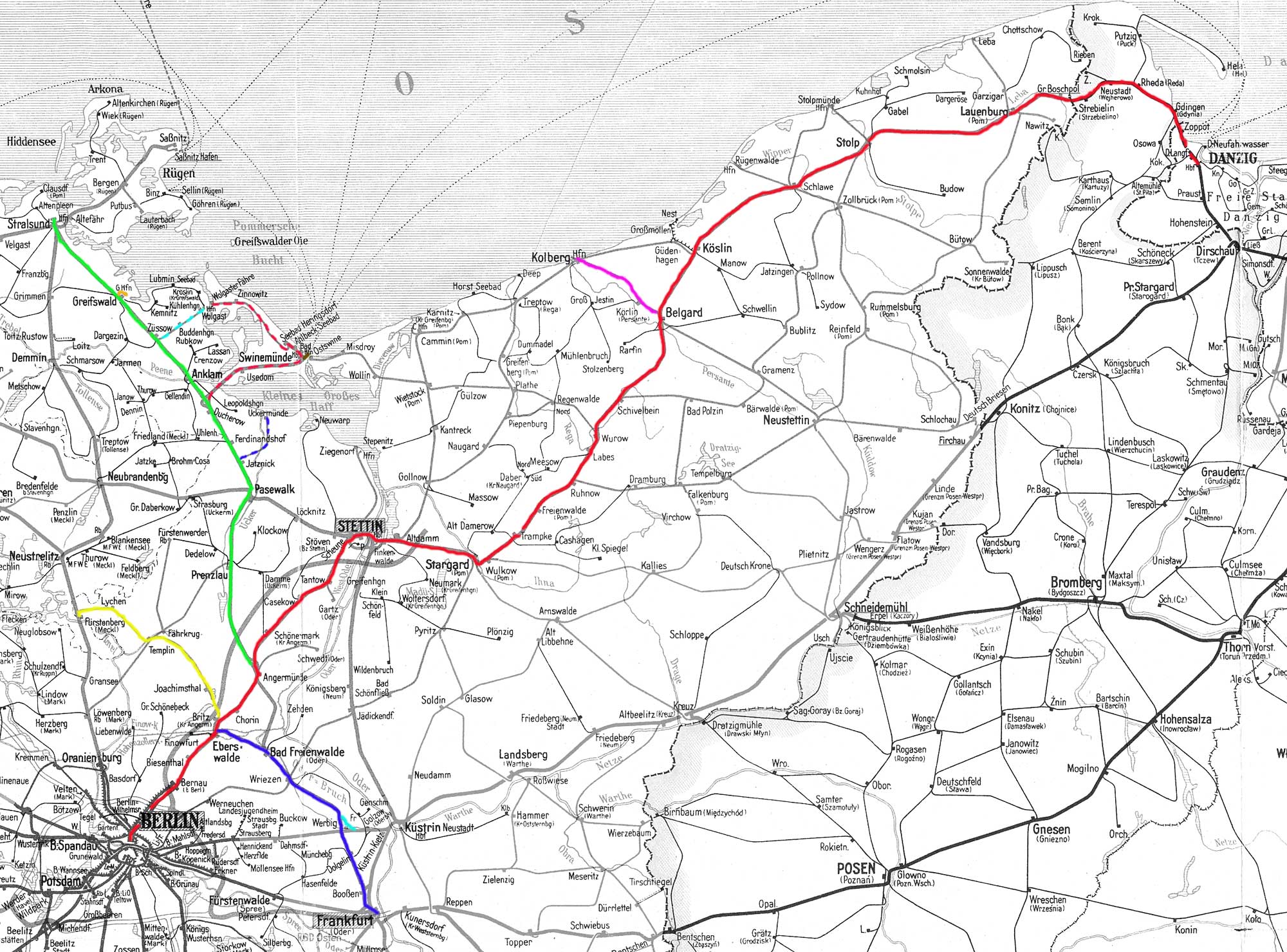 Berlin Stettiner Bf -0,28 - Stettin Hbf 134,41 - Belgard 280,01 - Stolp 371,46 - Gr. Boschpol 439,03 - Danzig Hbf 502,55