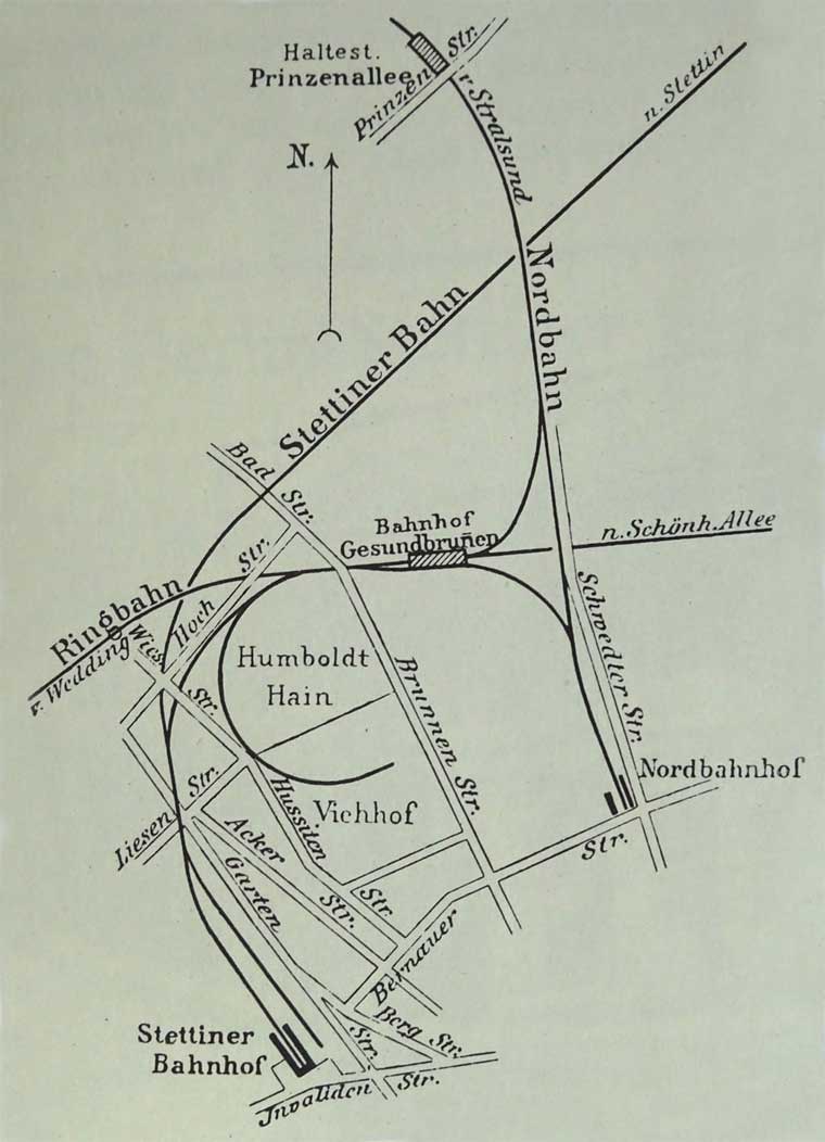| Berlin-Gesundbrunnen | 2,17 | km 0,63 der Verbindungsstrecke zur Nordbahn [Berlin Nordbahnhof (alt) 0,0 - Neustrelitz 98,53 - Neubrandenburg 133,73 - Stralsund 222,64 (kommend)/223,60 (gehend) - Saßnitz 272,72 - Saßnitz Hafen 274,46] |
