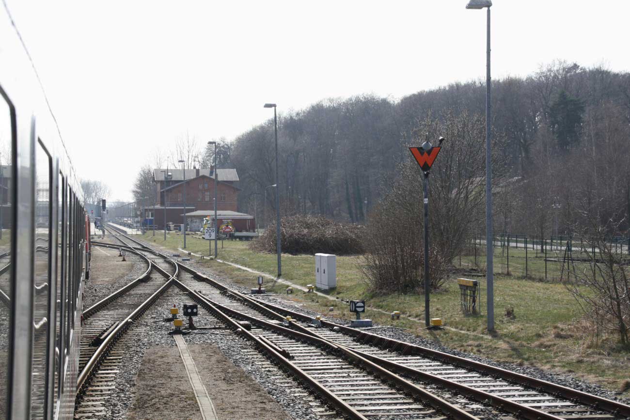 Links vom Empfangsgebäude an der Weiche 25 liegt km 192,0 der Strecke nach Wolgast.