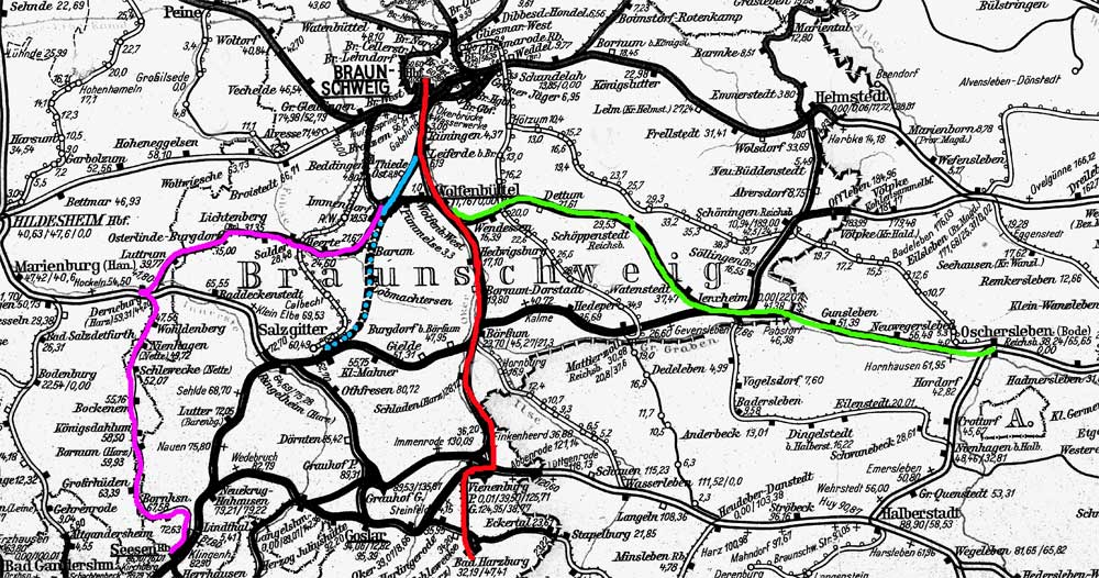 Nach der Verstaatlichung der Bahn im Jahre 1938 wurde der Abschnitt Braunschweig - Derneburg teilweise durch Neubaustrecken ersetzt. Gleichfalls gab es im Hbf Braunschweig Veränderungen. Im Oktober 1941 zunächst: Braunschweig Hbf (alt) 0,0 - Immendorf (heute Salzgitter-Drütte) 12,73, dann im November 1954: Salzgitter-Drütte 12,73 - Salzgitter-Lichtenberg 25,31 und Neukilometrierung bis Derneburg 38,08. Reststück bis heute wie vorher: Derneburg 44,20 - Seesen 76,01. |