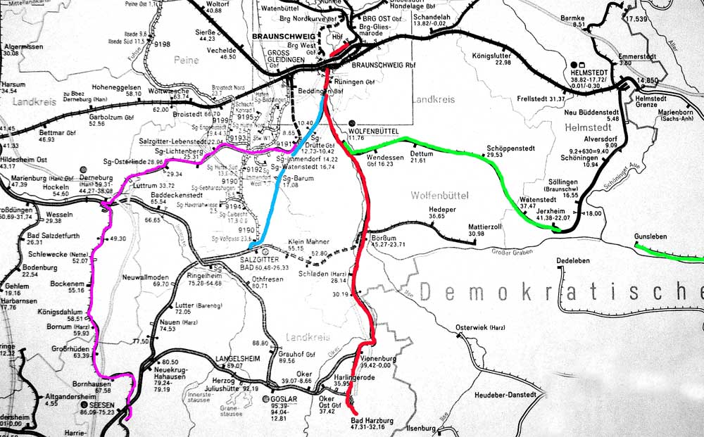 (Braunschweig Hbf 0,0) - Wolfenbüttel 11,76 - Jerxheim 41,38 - Grenze BRD/DDR 47,17 - Oschersleben (Bode) 65,65