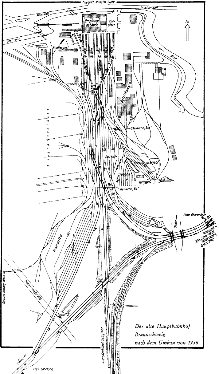 | Der Braunschweiger Bahnhof wurde 1838 als Kopfbahnhof in Betrieb genommen. Bereits 1845 wurde er durch einen Neubau an gleicher Stelle ersetzt. Der Kopfbahnhof genügte dem Aufkommen an Reisenden, Post und Fracht nicht mehr. Bereits in den Jahren von 1870 bis 1934 wurde über einen Durchgangsbahnhof diskutiert. 1938 kam es nochmals zu Erweiterungen und Planungen. Am 01.10.1960 wurde der neue Braunschweiger Hbf eingeweiht. Er liegt etwa dort, wo früher der Bahnhof Braunschweig Ost war. |