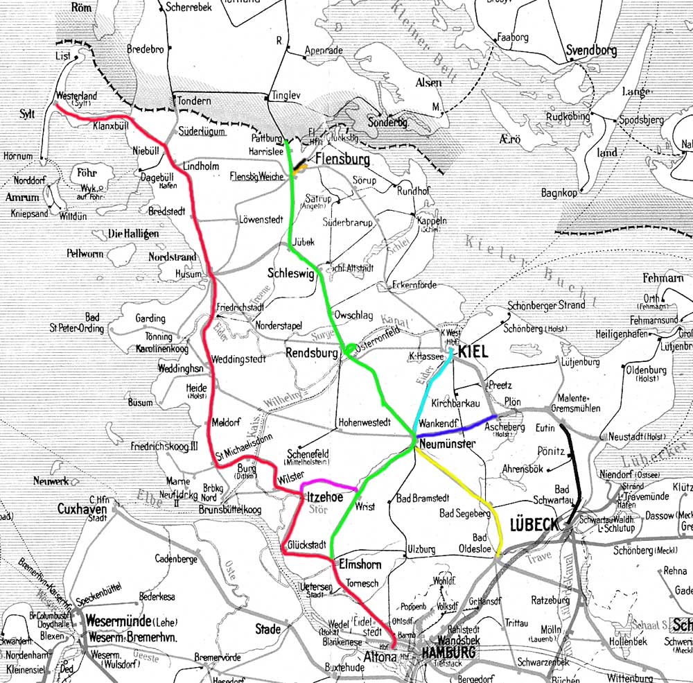 Hamburg-Altona 0,74 - Elmshorn 30,70 - Heide (Holst) 124,48 - Husum 158,26 - Niebüll 198,45 - Westerland (Sylt) 237,61