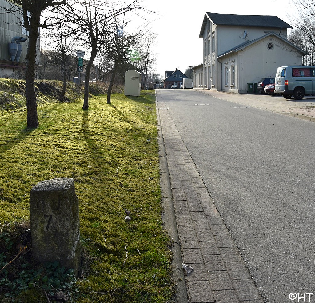 | ► | km 30,70 der abgehenden Strecke (Hamburg-Altona 0,74) - Elmshorn 30,70 - Wrist 52,23 - Neumünster 74,69 (kommend)/74,64 (gehend) - Schleswig 138,39 - Flensburg Abzw Weiche 171,15 - Abzw Friedensweg 174,57 - Grenze Deutschland/Dänemark 179,784 = (km 110,650 - Padborg 109,7 - Tinglev 95,3 - Fredericia 0,0) mit weiterlaufender Kilometrierung (Streckenverzweigung mit gemeinsamen Nullpunkt Hamburg-Altona) | |