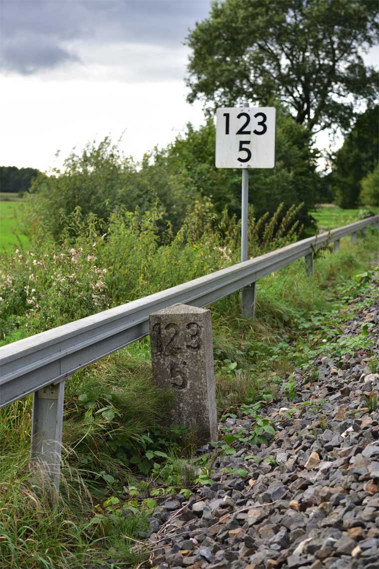 Unterhalb der Kilometertafel ist der Kilometerstein zu erkennen.