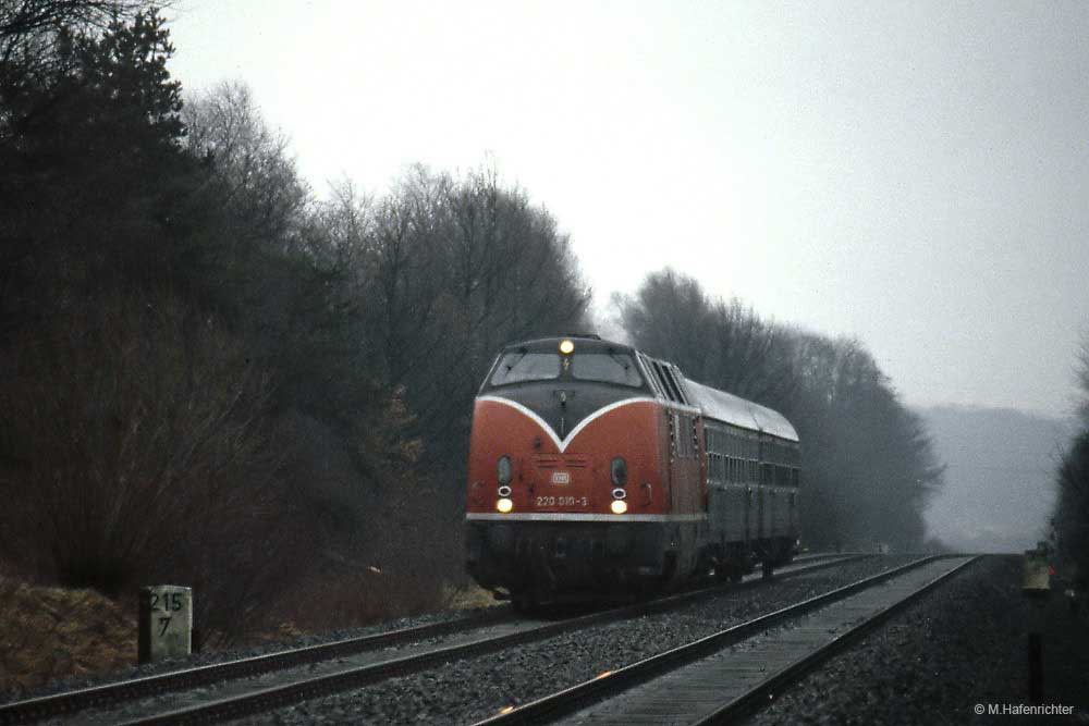 Cuxhaven, Stw. Cs am km 272,5 - 220 015 schiebt den abendlichen N 4469 aus dem Bahnhof