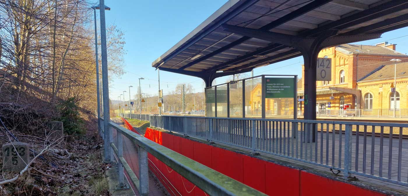| Hannoversch Münden | 142,03 | km 193,54 der Strecke Halle (Saale) Hbf 0,01 - Sangerhausen 59,22 - Nordhausen 97,07 - Eichenberg 170,48 - Hann. Münden 193,54 |