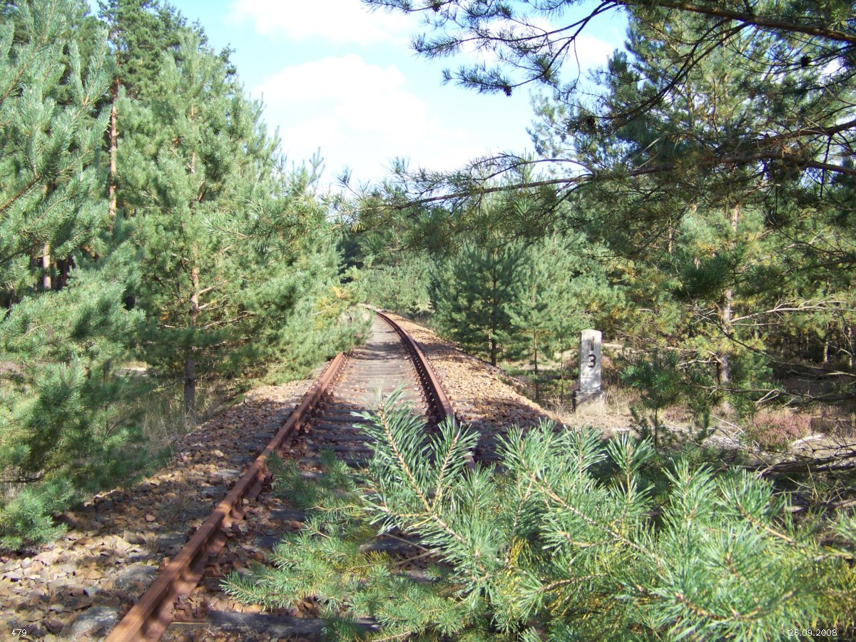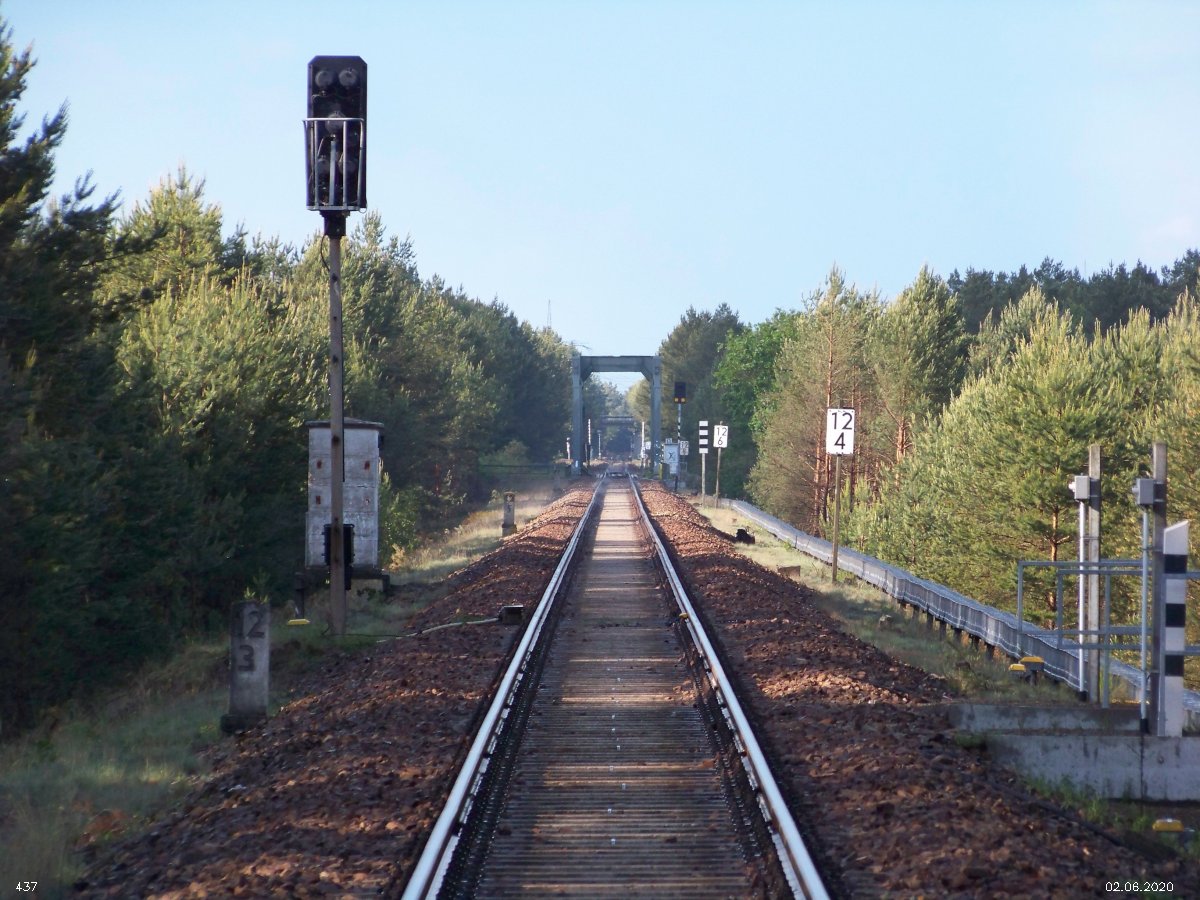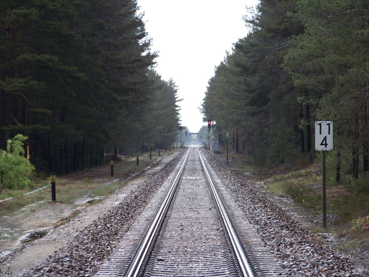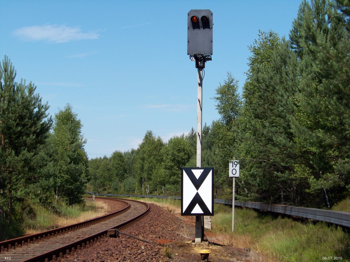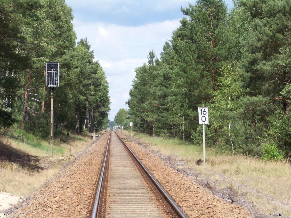 | km 53,00 der Strecke Großenhain Cottb. Bf 0,0 - Senftenberg 45,29 - Cottbus 80,00 - Peitz 94,81 - Streckenunterbrechung - Grunow (Niederlausitz) 129,27 - Frankfurt (Oder) 152,78 |