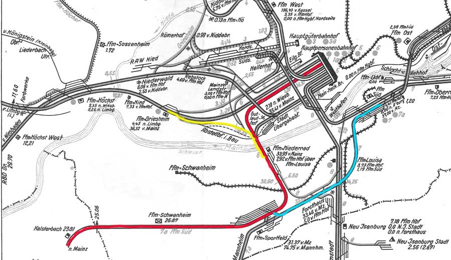 oben liegend: Frankfurt-Louisa, W 920, km 3,974 - Frankfurt-Niederrad, W 623, km 8,057 (3624) etwa km 7,0