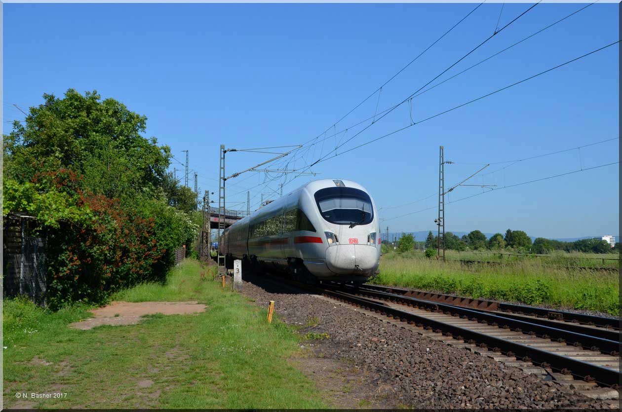 Der Zug befindet sich auf dem Gegenrichtungsgleis der Strecke nach Frankfurt (Main) Hbf