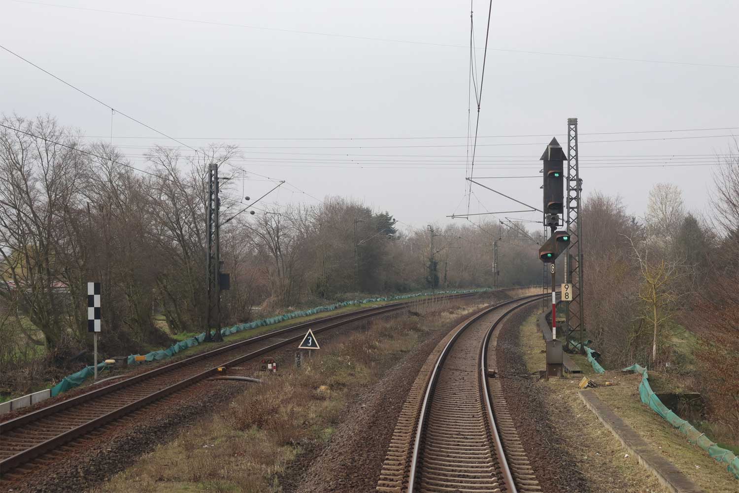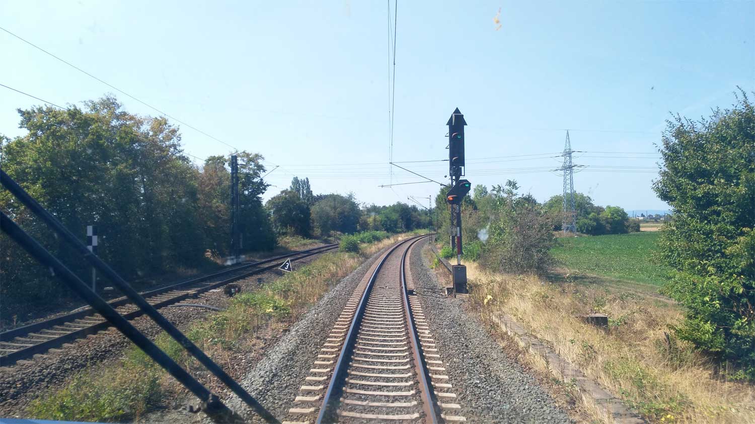 km 36,1 (Stein) hat sich etwas hinter dem Pfosten der Vorsignalbake versteckt
