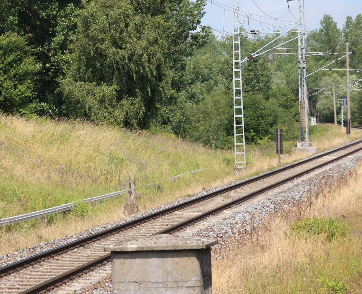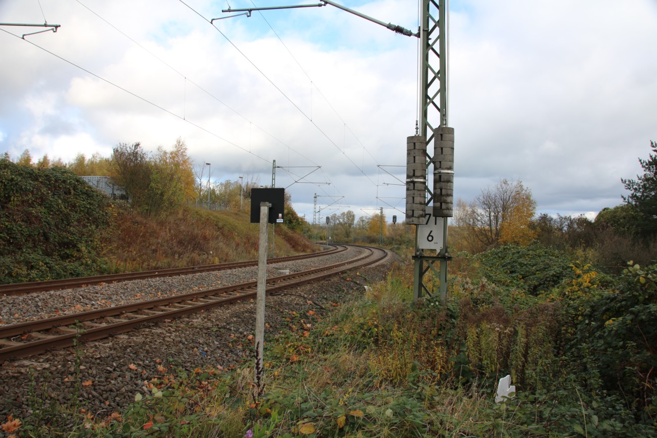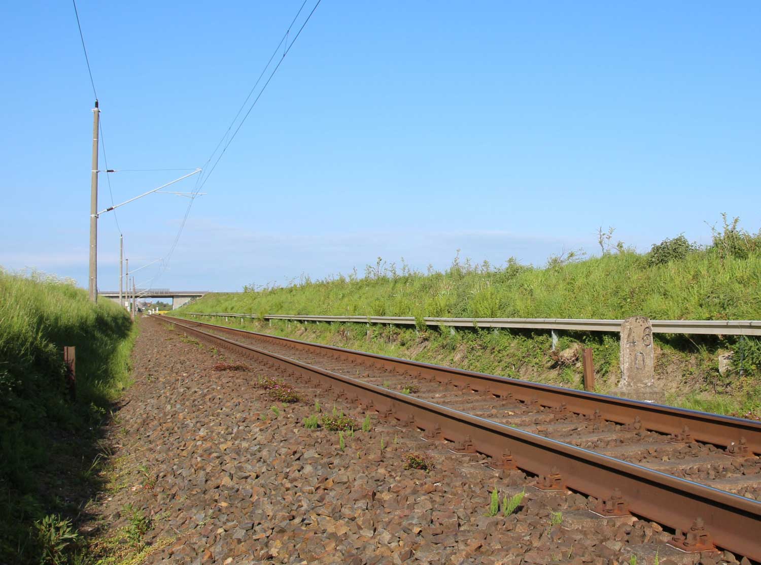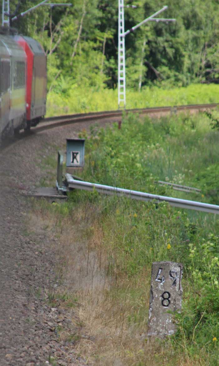 km 1,2 (Tafel und Stein) gehört zur Strecke Abzw Riekdahl, W 1 km 0,87 - Rostock Seehafen Nord km 9,228 (6443)