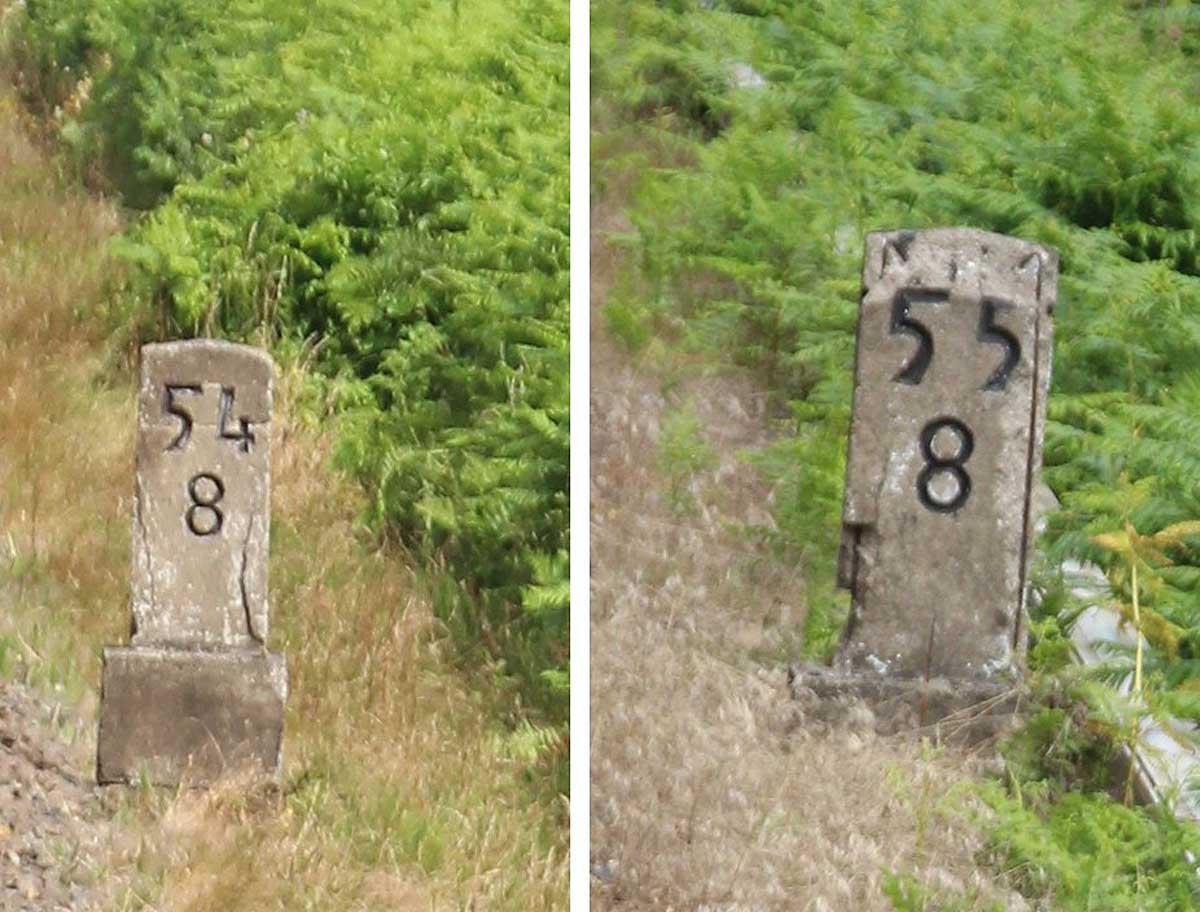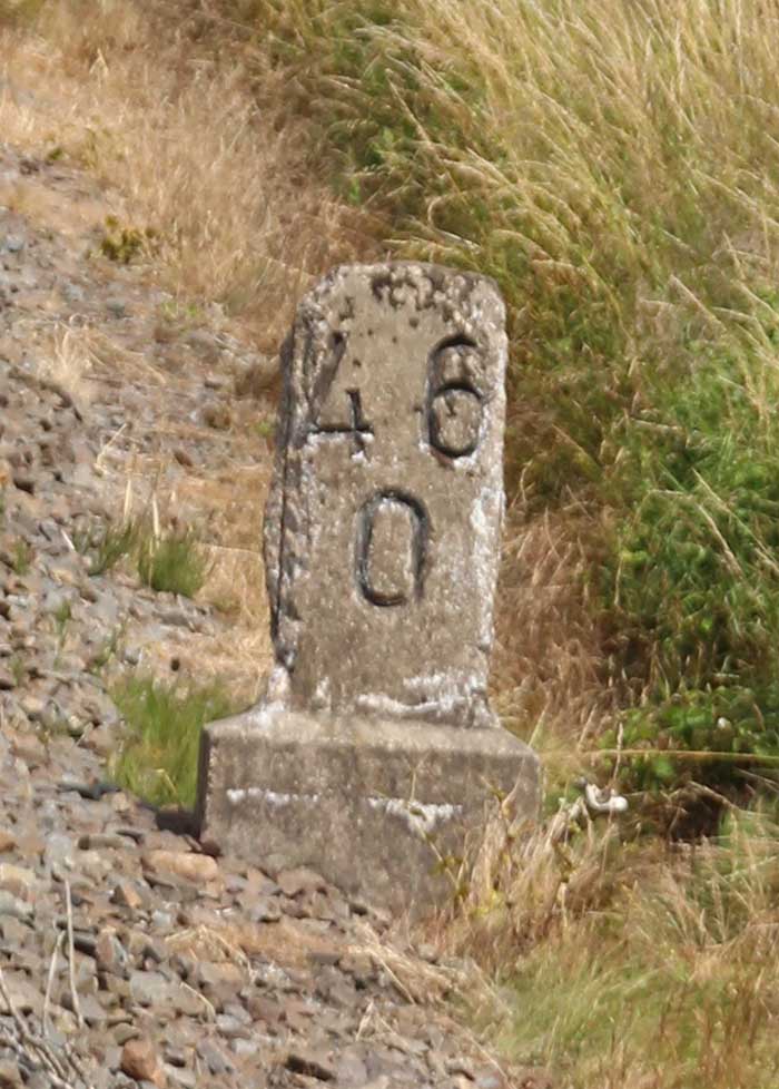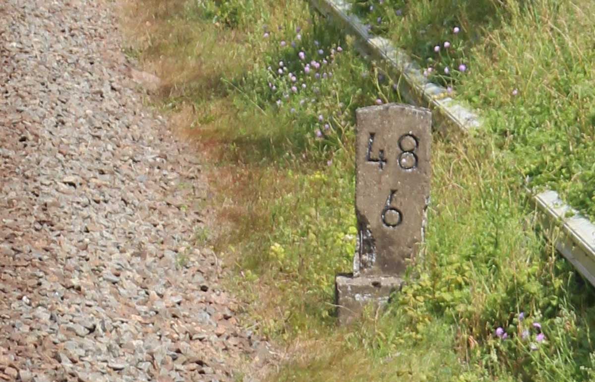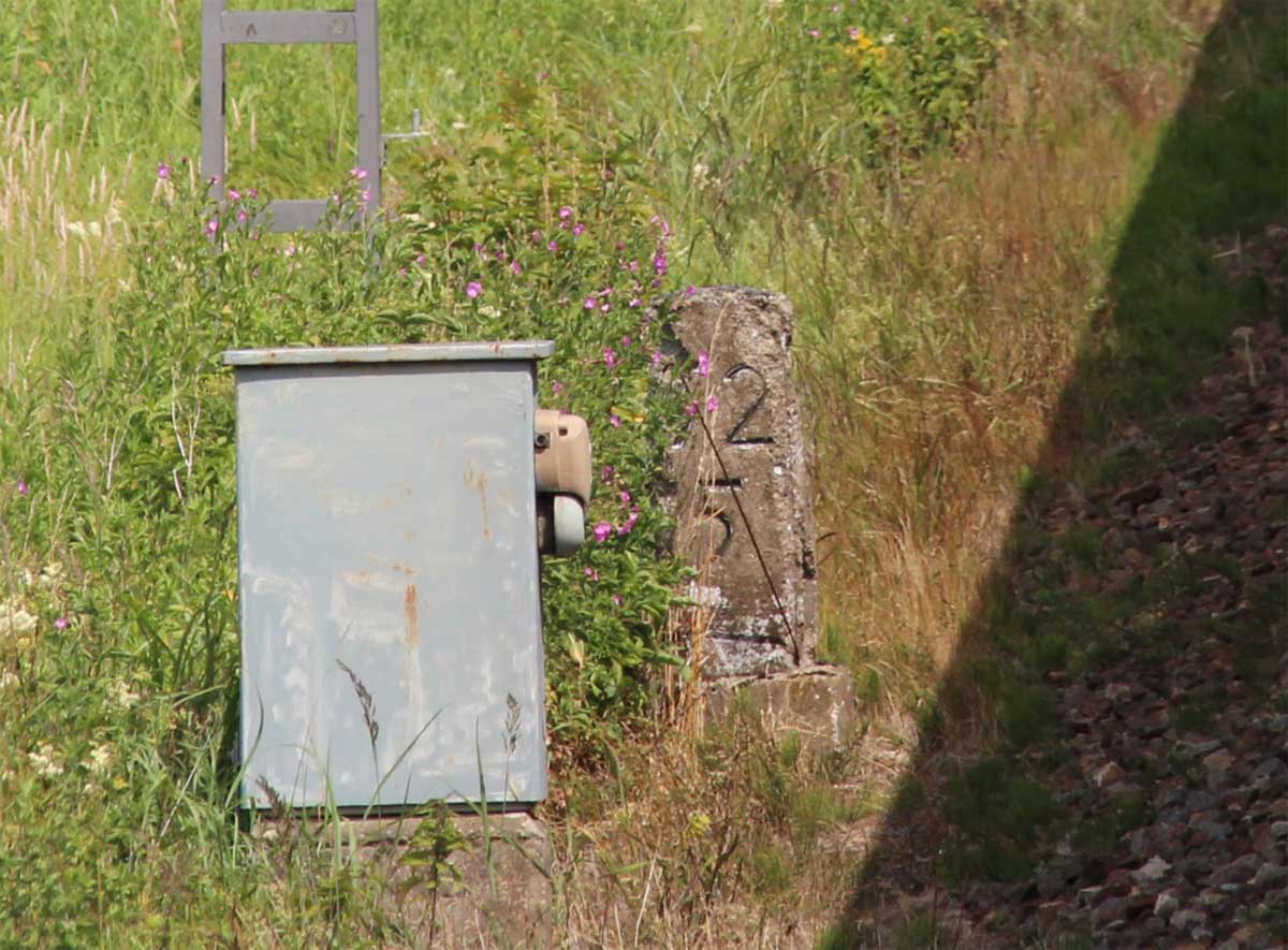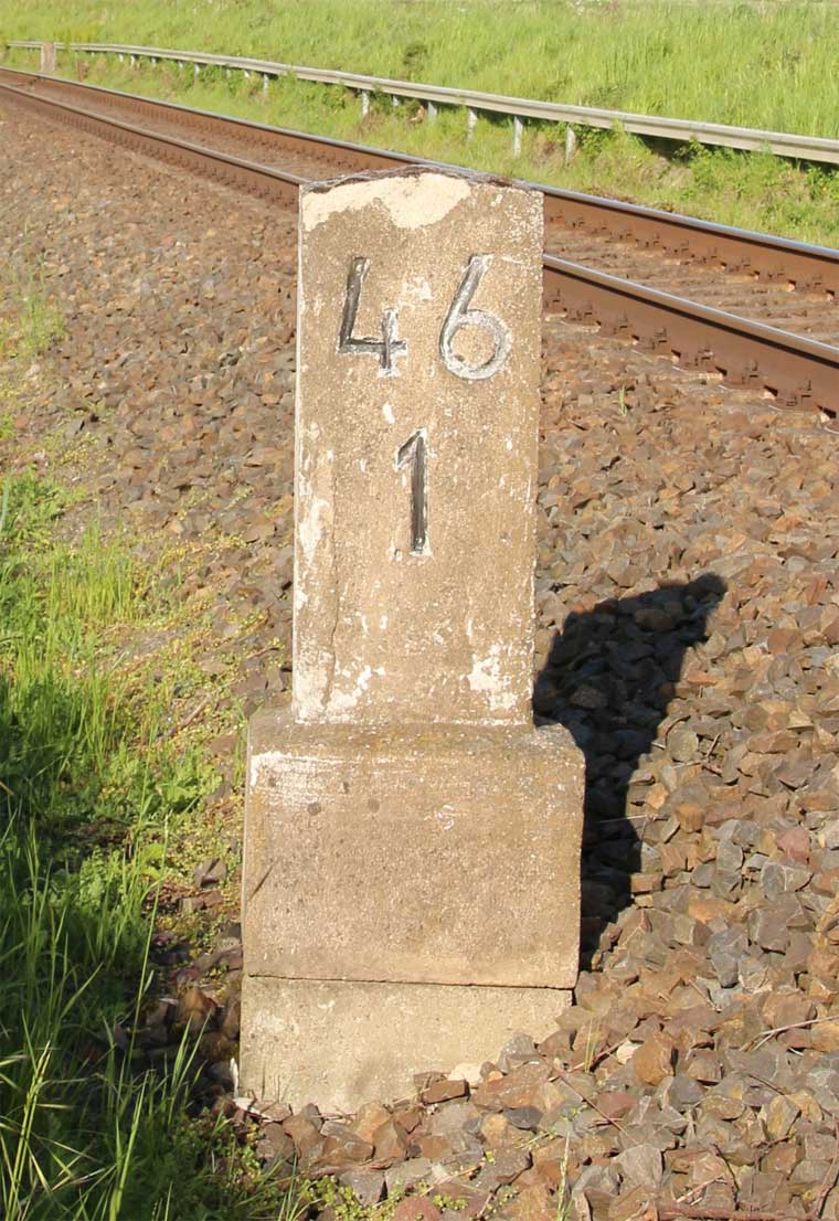 km 0,6 (Tafel); km 0,7 (Stein); km 0,8 (Tafel und Stein) und km 0,9 (Stein) gehören zur Strecke