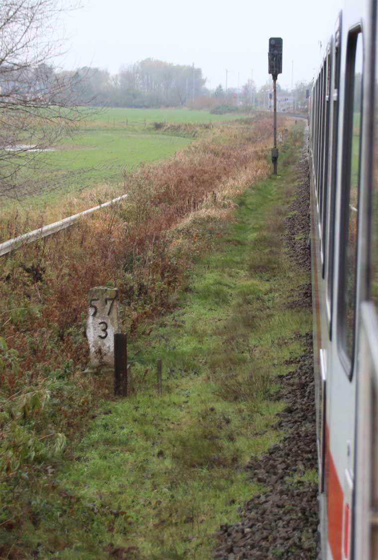 km 0,4 (Tafel); km 0,5 (Stein) und km 0,6 (Stein) der Strecke Bentwisch 0,0 - Rostock Seehafen Süd 3,50