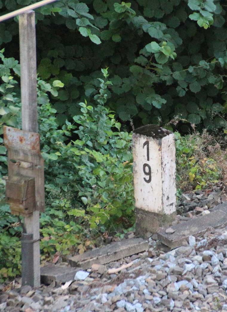 Die Tafel rechts scheint den Kilometerwechsel zu dokumentieren.