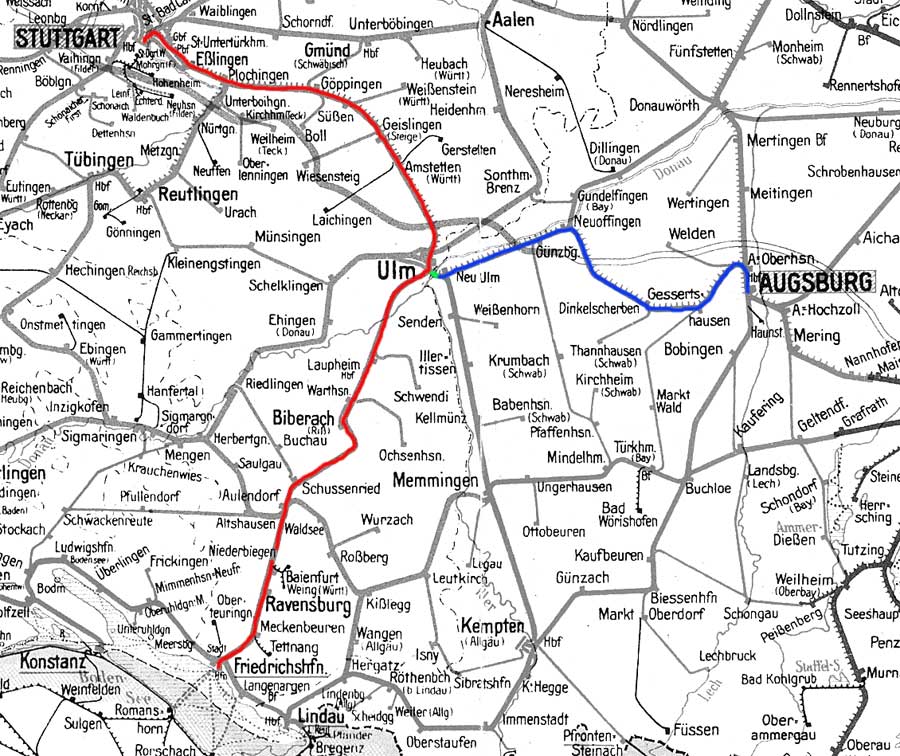 | (Stuttgart Hbf) - Ulm Hbf - Landesgrenze Württemberg/Bayern - (Neu-Ulm - Augsburg Hbf) |