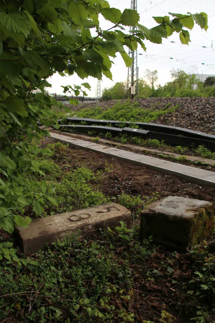 ausgediente Kilometersteine als Treppe zum Bahngelände in Ludwigsburg